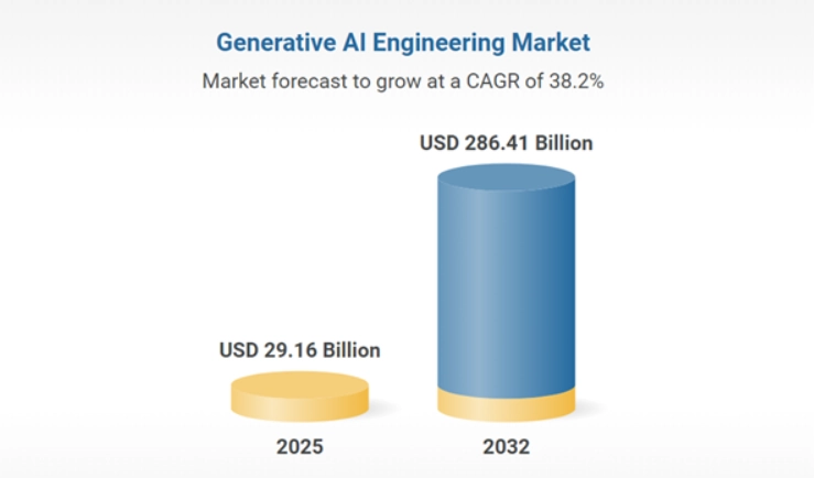The global generative AI engineering market is growing at an exceptional pace, projected to expand from about USD 21.57 billion in 2024 to USD 29.16 billion in 2025, and expected to reach nearly USD 286.41 billion by 2032 at a CAGR of over 38%. This rapid expansion reflects increasing enterprise investment in generative AI technologies across sectors.