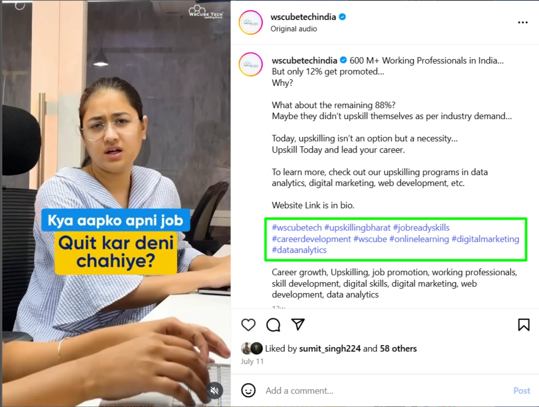 - Add 3–5 broader discovery tags (#FitnessReel, #ReelOfTheDay, #ExploreReels) and 2–3 branded or community tags (#YourBrandName, #GrowWithWsCube).