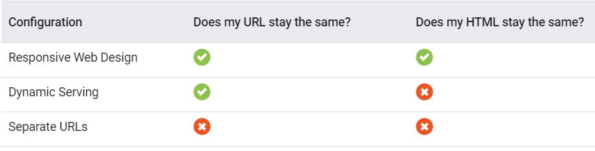 Of all the three mobile configuration methods, Google recommends Responsive Web Design. Separate URLs setup is not recommended because it is a problematic method for implementation and maintenance.